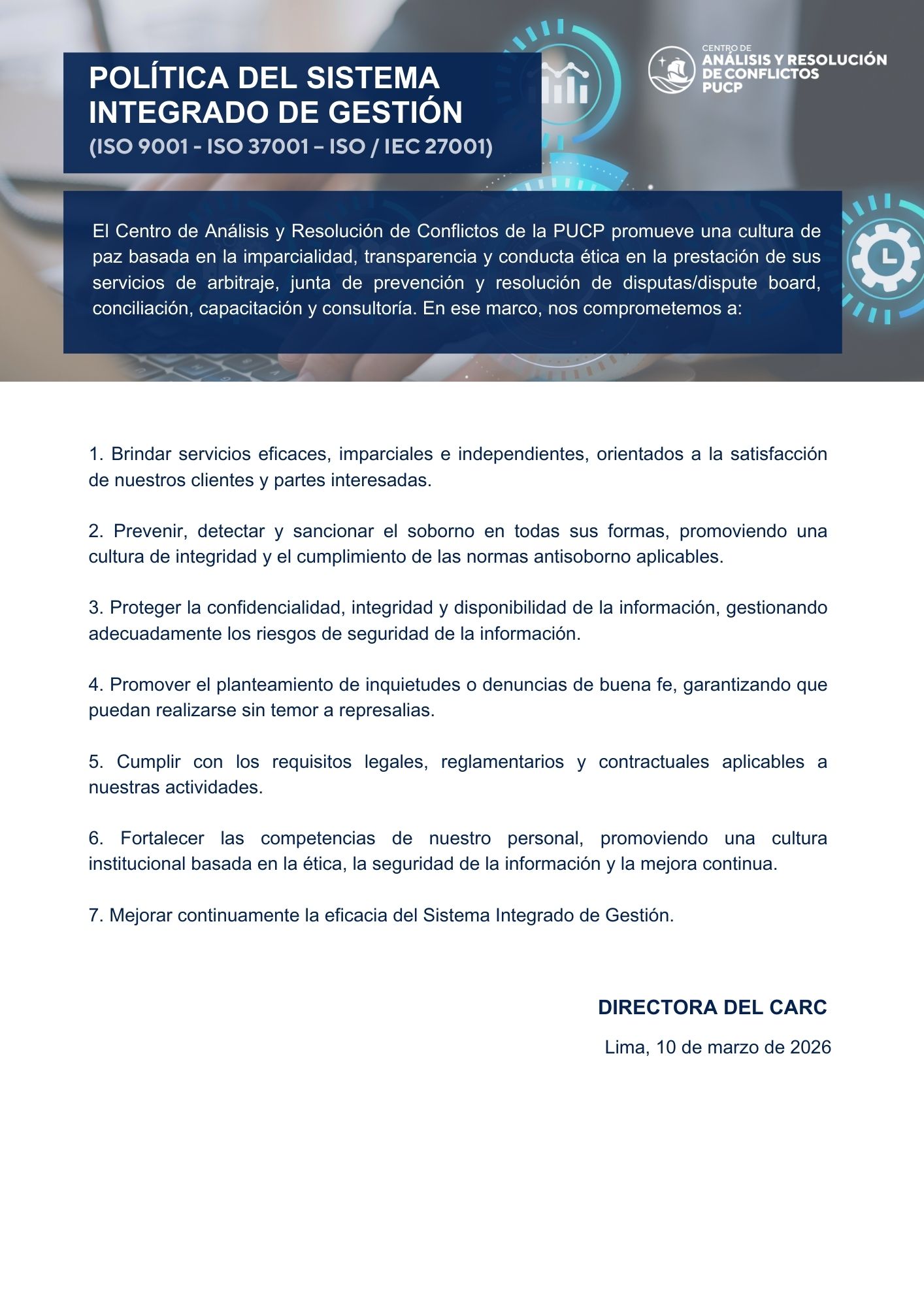 Política integrada del Sistema Gestión - Centro de Análisis y Resolución de Conflictos PUCP