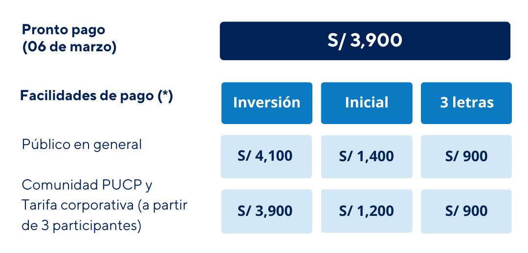 *Financiamiento de acuerdo a previa evaluación. La evaluación de financiamiento se debe realizar máximo hasta 2 semanas antes del inicio de clases. Para poder acceder al pago en letras, el/la solicitante no debe tener deuda pendiente con la PUCP ni estar reportado/a en las centrales de riesgo.